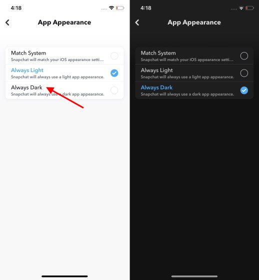 4. En la configuración de”Apariencia de la aplicación”, elija” Siempre oscuro “para habilitar el modo oscuro en Snapchat desde su iPhone.