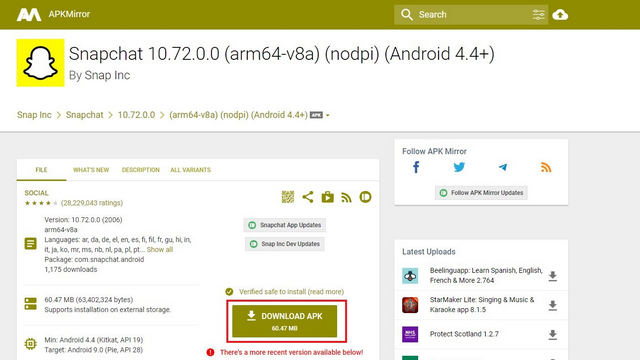 4. Haga clic en enlace APKMirror y presione el botón”Descargar APK”para descargar la versión 10.72.0.0 de Snapchat en su dispositivo. Es posible que se pierda nuevas funciones si adopta este enfoque, pero ese es un sacrificio que tendrá que hacer para obtener el tema oscuro de Snapchat de inmediato.