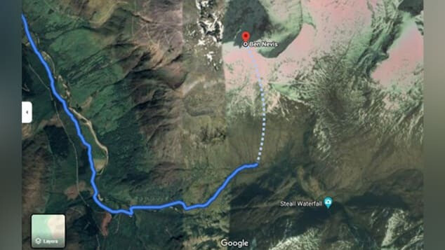 Esta imagen muestra una ruta peligrosa sugerida por Google Maps para escalar la montaña más alta de Escocia