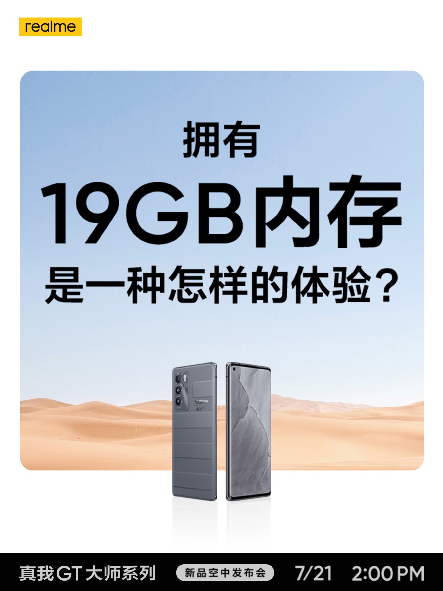 Xu Qi, vicepresidente de Realme y presidente de marketing dijo que el Realme GT Master El teléfono móvil de edición tendrá una memoria de 19 GB . Sin embargo, no debe tomarlo literalmente. Queremos decir que la capacidad de RAM no es de 19 GB físicamente. En su lugar, vendrá con 12 GB + 7 GB de RAM, de los cuales 7 GB deberían pertenecer a la memoria extendida.