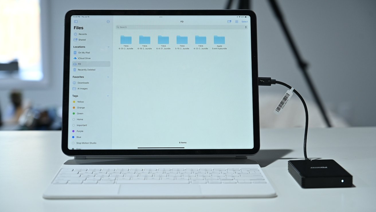 En el iPad Pro 2021, su único puerto tipo C ahora es compatible con Thunderbolt 3 gracias a la incorporación del procesador M1 diseñado por Apple. Cuando se conectó, la unidad apareció inmediatamente para nosotros en la aplicación Archivos.