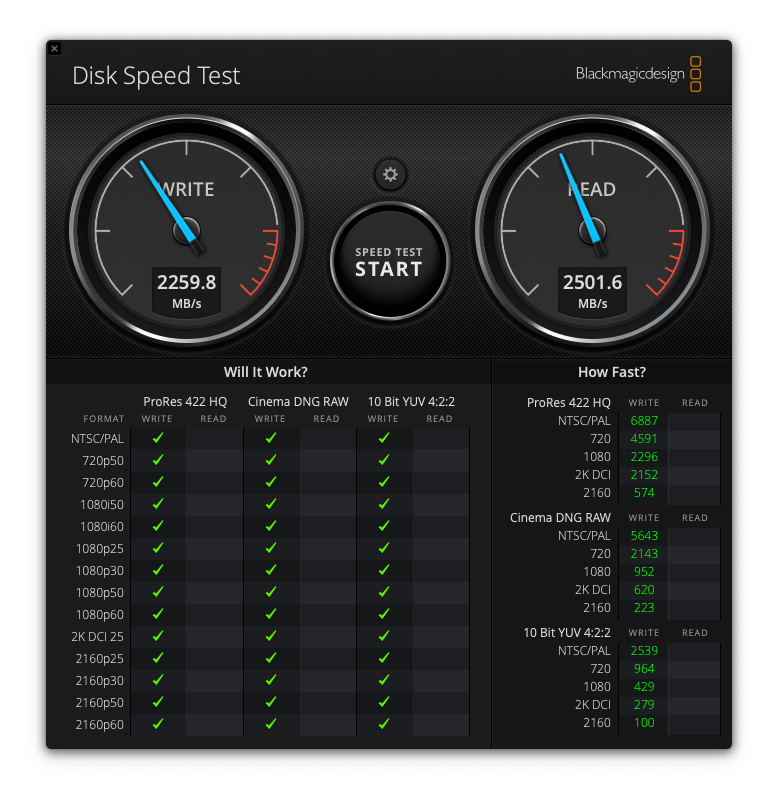 Realizamos varias rondas en la prueba de velocidad de disco de Blackmagic para ver cómo se compara con las velocidades anunciadas por la compañía. Fantom Drives dice que debería experimentar hasta 2.800 Mbps en velocidades de lectura y hasta 2.300 Mbps en velocidades de escritura. En la prueba de Blackmagic, vimos velocidades reales de 2260 MBps y 2500 MBps. Eso es bastante bueno, especialmente en las velocidades de escritura.