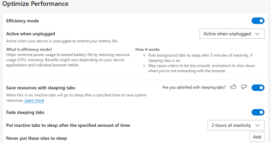 Este tutorial explica cómo habilitar o deshabilitar el modo de eficiencia en Microsoft Edge . El nuevo modo de eficiencia ayuda a minimizar el uso de energía para extender la vida útil de la batería al reducir el uso de recursos en su computadora portátil, como CPU, memoria. Se activa automáticamente en función de las condiciones establecidas por usted.