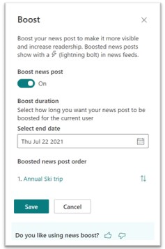SharePoint presenta una nueva función News Boost que permitirá a los administradores impulsar publicaciones de noticias importantes en los sitios de noticias de la organización, para todos los empleados y garantizar un mayor número de lectores.
