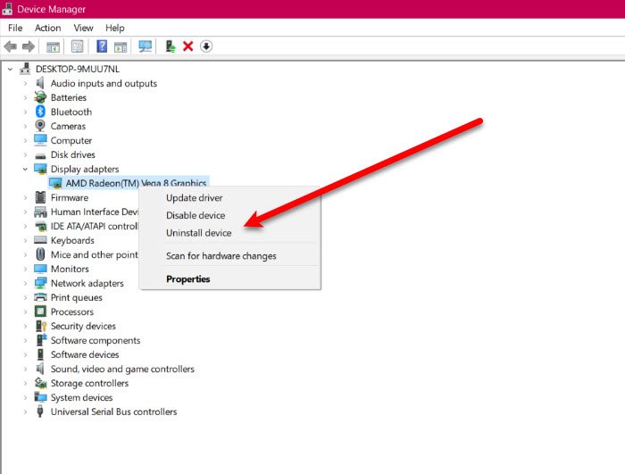 Inicie el Administrador de dispositivos en Win + X> Administrador de dispositivos. Amplíe Adaptador de pantalla , haga clic con el botón derecho en el controlador de gráficos Seleccione Desinstalar dispositivo. Haga clic en Desinstalar para confirmar su acción.