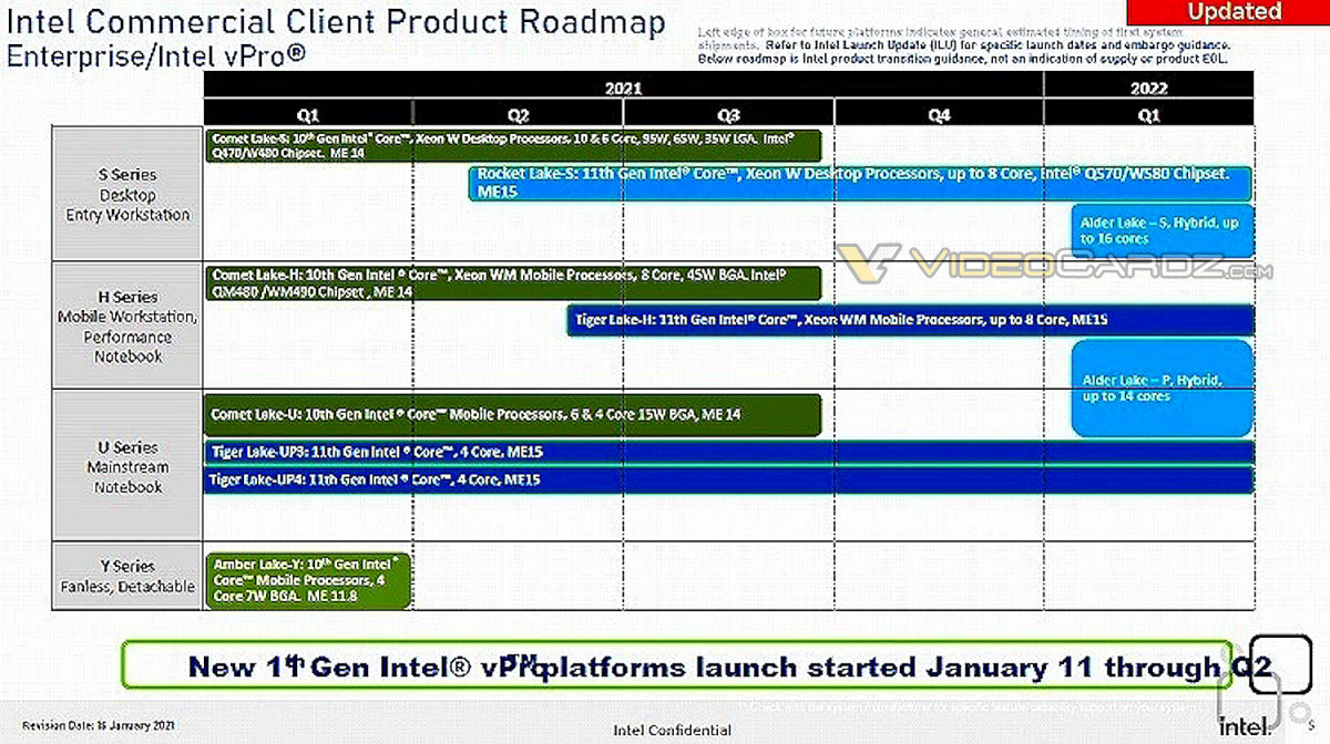 La hoja de ruta confirma que la computadora de escritorio Alder Lake-S vPRO, que es más que probable que comparta las especificaciones con el consumidor Alder Lake-S ofrecerán hasta 16 núcleos. Las especificaciones de la parte superior Core i9-12900K SKU ya se han filtrado, por lo que este recuento de núcleos ya no debería ser una sorpresa.