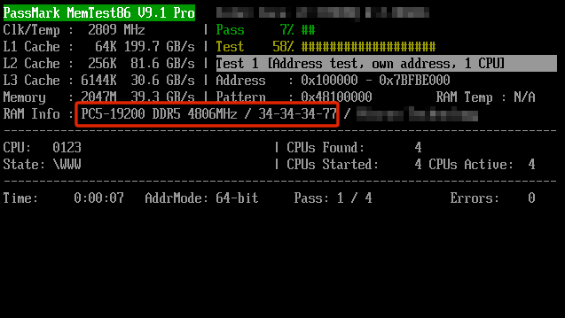 La última versión de MemText86 9.1 Pro admite memoria DDR5, según la captura de pantalla publicada por la compañía en Twitter. Parece que la memoria se estaba ejecutando con las especificaciones PC5-19200, que son 4800 MHz. Esta es la frecuencia más lenta para la memoria DDR5 según las especificaciones JEDEC.