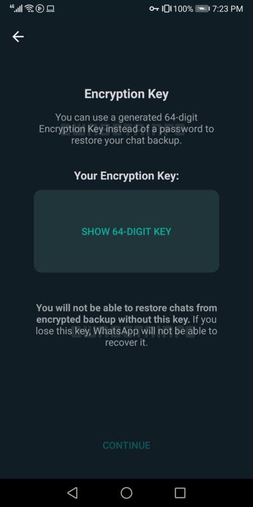 Las copias de seguridad encriptadas de un extremo a otro también admiten una clave de encriptación que se puede usar para restaurar su contraseña. Solo puede contener dígitos numéricos y letras minúsculas entre”a”y”f”. Si pierde esta clave, WhatsApp no puede ayudarlo a recuperarla.