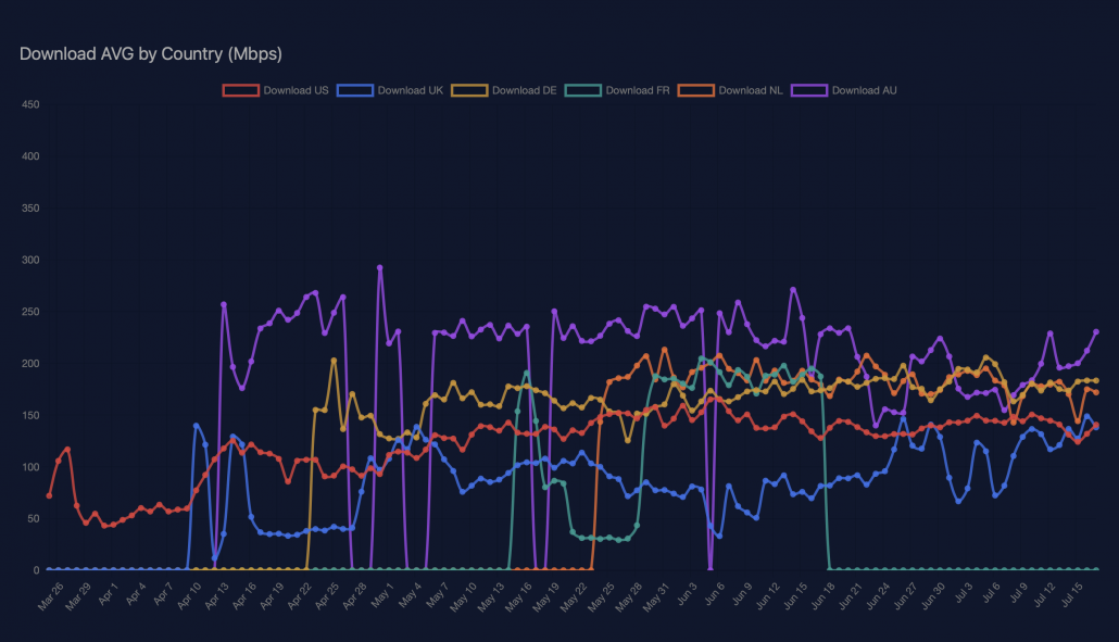Si bien la herramienta proporciona estadísticas de rendimiento tabuladas solo para la UE, EE. UU. Y todo el mundo, proporciona gráficos de rendimiento que muestran las velocidades de descarga para EE. UU., Reino Unido, Dinamarca, Francia, Países Bajos y Australia.