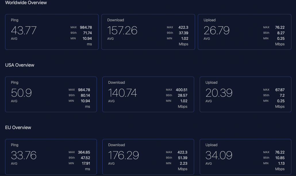 Según los resultados, los usuarios de la Unión Europea están experimentando velocidades más altas para Starlink que sus contrapartes en los EE. UU. La velocidad de descarga promedio para un usuario europeo es de 176 Mbps, y las velocidades de descarga más alta y más baja son 422 y 2,2 Mbps, respectivamente. Sin embargo, si bien las velocidades de descarga son las más altas de Europa, América del Norte presenta las puntuaciones de latencia más bajas.