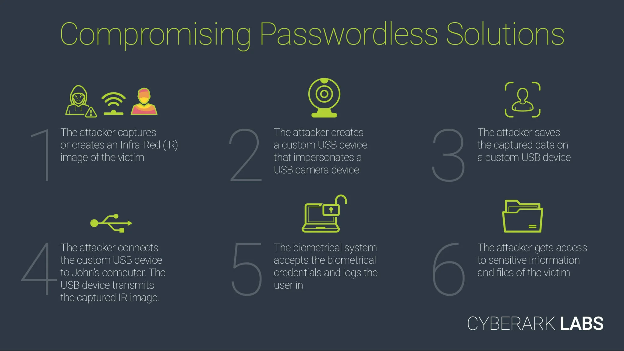 CyberArk Labs dice que la imagen de infrarrojos puede ser capturada por cámaras especiales de infrarrojos de largo alcance o por cámaras colocadas subrepticiamente en el entorno del objetivo, como un ascensor.
