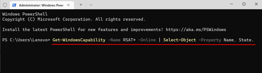 Get-WindowsCapability-Nombre RSAT*-En línea | Seleccionar-Objeto-Nombre de la propiedad, Estado.