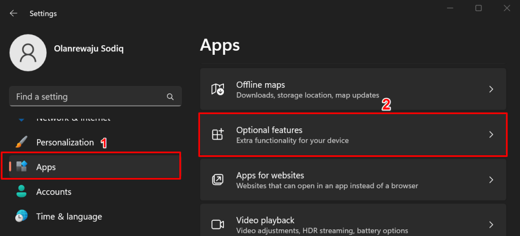 Abra la aplicación Configuración de Windows, seleccione Aplicaciones en la barra lateral y seleccione Funciones óptimas.