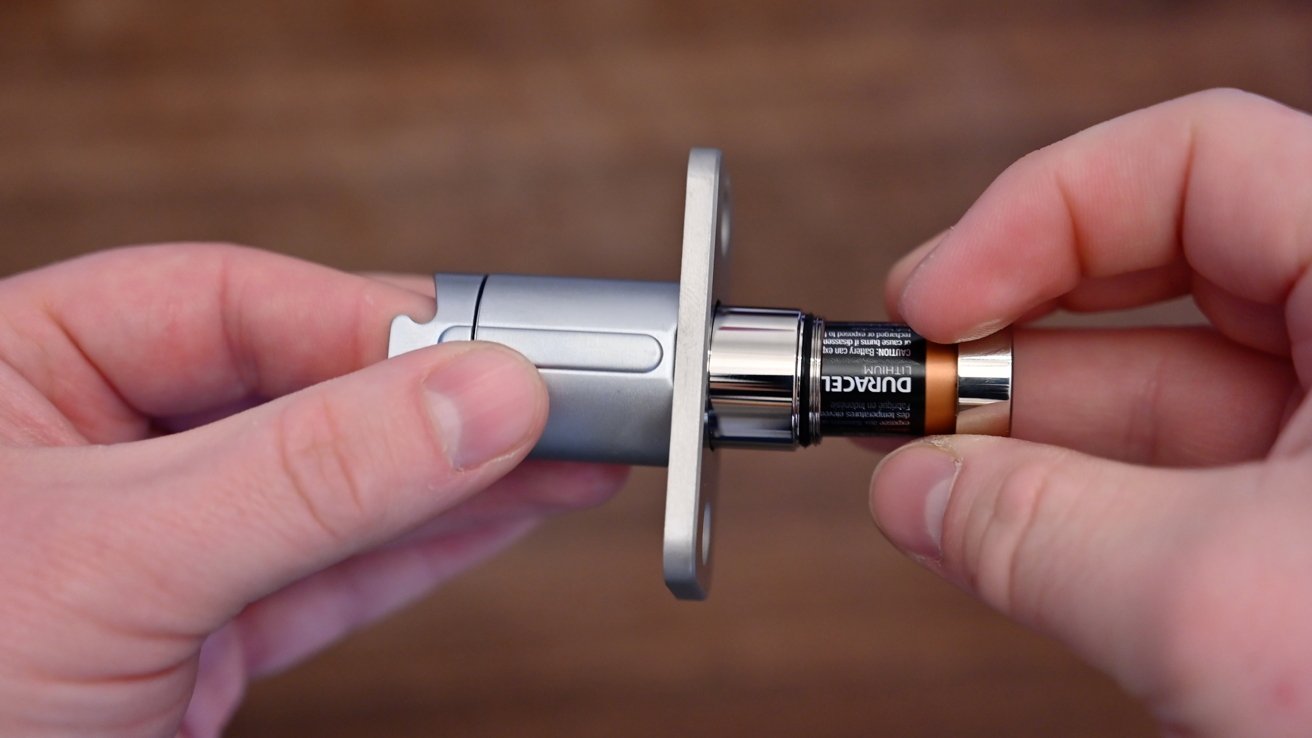 La batería, una CR2 estándar de litio de 3 V, se esconde dentro del cerrojo. Extienda el cerrojo mientras la puerta está abierta y desenrosque la tapa del extremo.