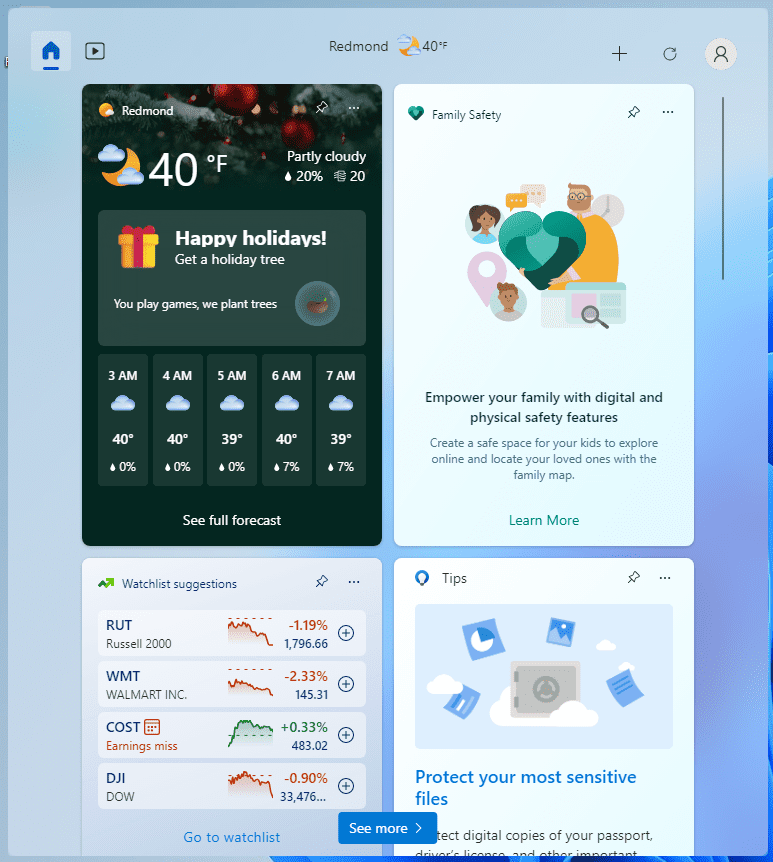El panel del tablero de widgets en Windows 11 Insider Preview Build 25262 en Dev Channel (Crédito de la imagen: Microsoft)