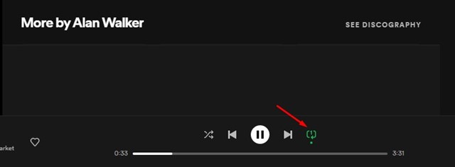 3. A continuación, en los controles de reproducción de Spotify, toque el botón Repetir. El botón de repetición en Spotify parece dos flechas en círculo.