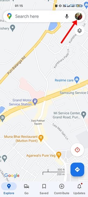 1. Avaa ensin Google Maps-sovellus Android-laitteellasi. Napauta seuraavaksi profiilikuvaa alla olevan kuvan mukaisesti.