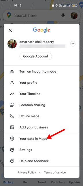 2. Valitse ponnahdusvalikosta Tietosi Mapsissa.