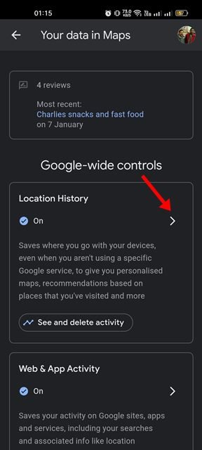 3. Vieritä Tietosi Mapsissa-sivulla alas ja napauta Sijaintihistoria-vaihtoehtoa.