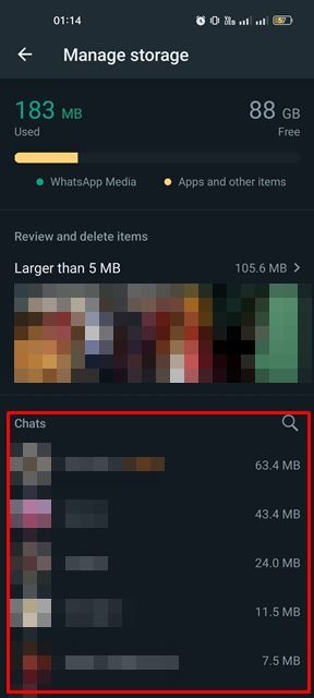 6. Näet myös samalla näytöllä keskustelut, joissa useimmat tiedostot vaihdettiin. Sinun on napautettava keskusteluja löytääksesi ja poistaaksesi tiedostot manuaalisesti.