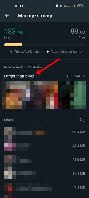 7. WhatsAppin tallennustilan hallintaominaisuus näyttää myös yli 5 Mt:n tiedostot. Sinun täytyy napauttaa Isompi kuin 5 Mt-osiota ja poistaa tiedostot, joita et halua tallentaa.