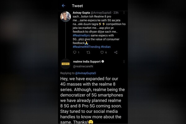 En répondant à un tweet d’utilisateur, le Le service client de Realme India a déclaré que la société prévoyait de lancer Realme 8 5G et Realme 8 Pro 5G bientôt, sans partager les détails exacts. La société a déjà lancé la série Realme 8 4G en Inde. Le vanilla 8 est alimenté par un SoC MediaTek G95, tandis que le modèle Pro est livré avec un SoC Snapdragon 720G. Notamment, le Realme 8 5G régulier est apparu sur le site Web de la FCC américaine avec le numéro de modèle RMX3241. Le smartphone devrait désormais embarquer un processeur MediaTek Dimensity série 700.