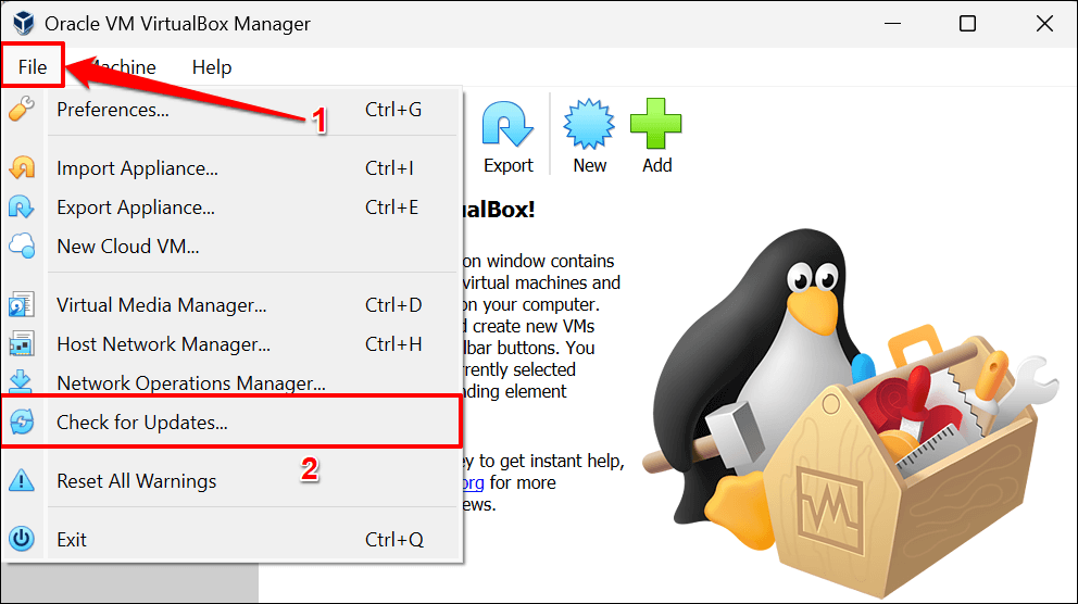 Vous pouvez également mettre à jour VirtualBox directement dans l’application. Ouvrez l’application VirtualBox Manager, sélectionnez Fichier dans la barre de menus, puis sélectionnez Rechercher les mises à jour.