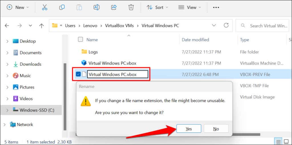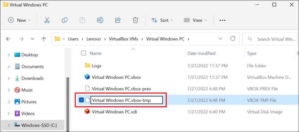 Copiez ou sauvegardez les deux fichiers (.vbox-tmp et.vbox-prev) quelque part sur votre ordinateur. Modifiez l’extension de fichier du fichier temporaire de.vbox-prev à.vbox.