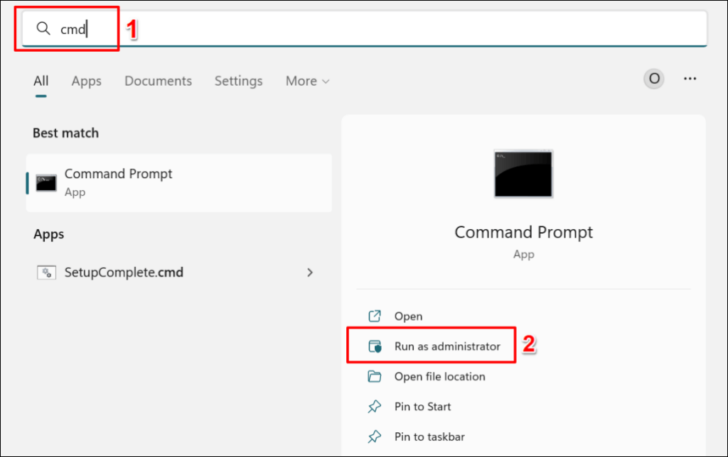 Ouvrez le menu Démarrer, tapez cmd dans la barre de recherche et sélectionnez Exécuter en tant qu’administrateur sous l’application Invite de commandes.