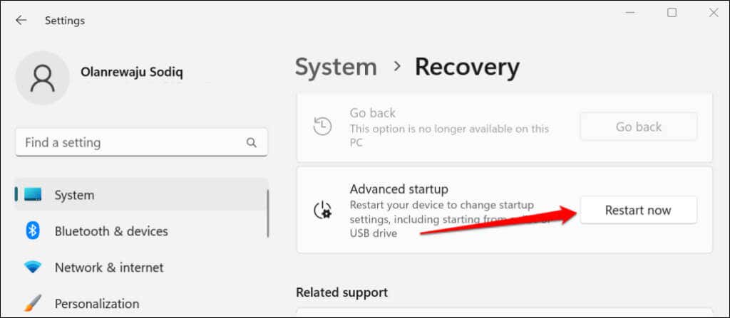 Accédez à Paramètres > Système > Récupération > Démarrage avancé et sélectionnez Redémarrer maintenant.