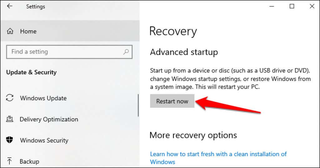 Dans Windows 10, accédez à Paramètres > Mises à jour et sécurité > Récupération et sélectionnez Redémarrer maintenant dans la section”Démarrage avancé”.