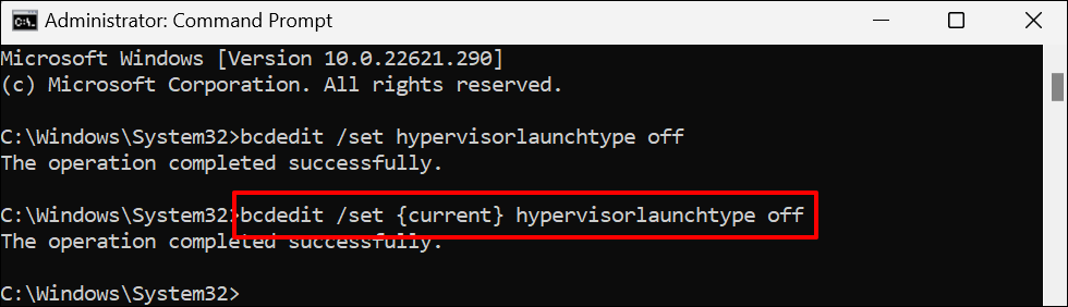 Collez bcdedit/set {current} hypervisorlaunchtype off dans la console d’invite de commande et appuyez sur Entrée.