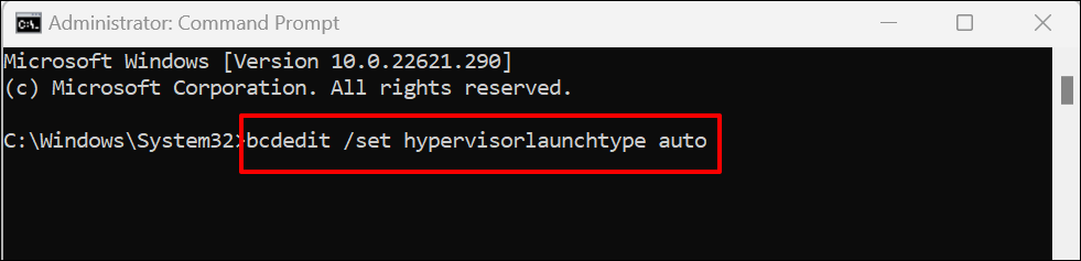 Collez bcdedit/set hypervisorlaunchtype off dans la console d’invite de commande et appuyez sur Entrée.
