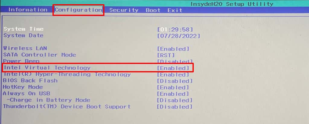 La manière dont vous activez la virtualisation dans les paramètres du BIOS dépend du fabricant ou du modèle de votre PC. Pour les appareils Lenovo, accédez à la section Configuration et définissez la technologie virtuelle Intel sur Activé.
