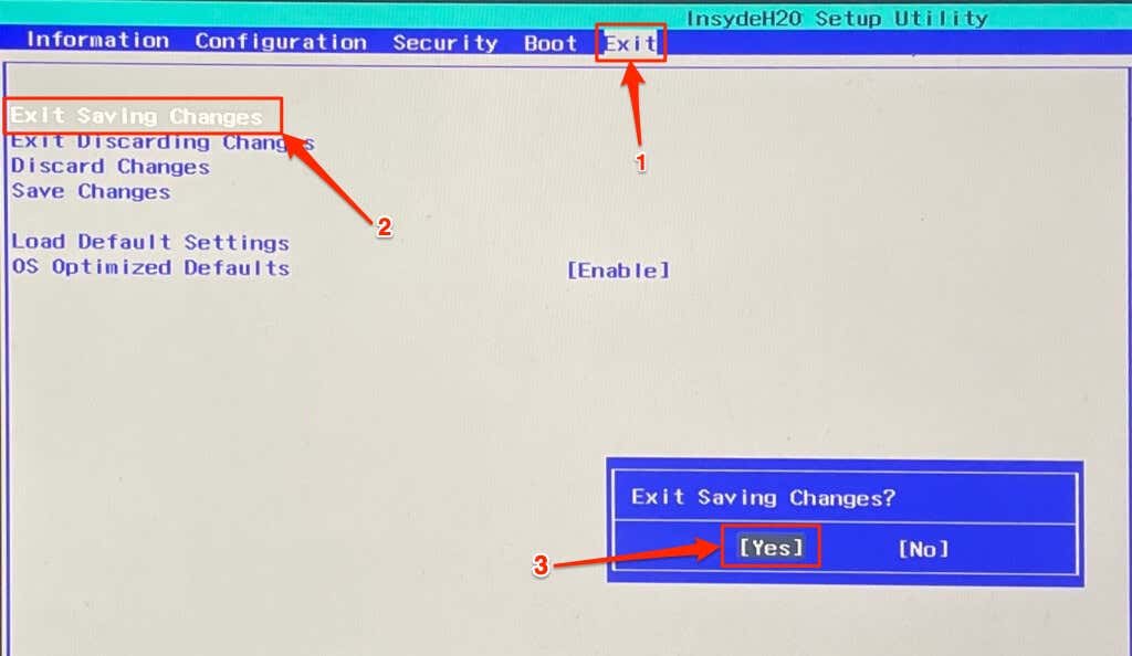 Dirigez-vous vers la section”Quitter”, sélectionnez Quitter en enregistrant les modifications, puis sélectionnez Oui pour démarrer Windows.