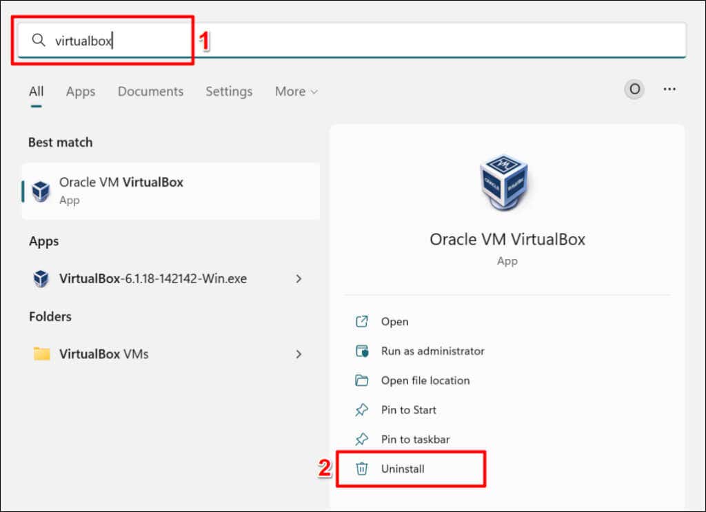 Tapez virtualbox dans la recherche du menu Démarrer, sélectionnez Désinstaller sous l’application Oracle VM VirtualBox et suivez l’invite de désinstallation.