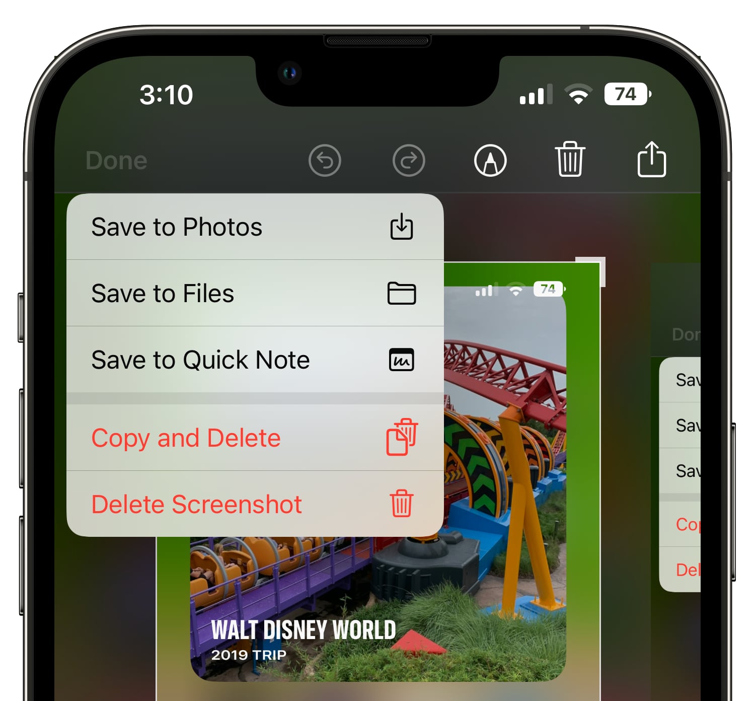 Lorsque vous fermez l’outil d’édition de capture d’écran, il y a une interface mise à jour dans le coin supérieur droit qui donne les options pour supprimer une capture d’écran, copiez et supprimez-la ou enregistrez-la. Ce menu se trouvait auparavant au bas de l’iPhone, donc cette nouvelle implémentation est plus élégante et moins dans votre visage car elle ne prend pas le bas de l’écran.