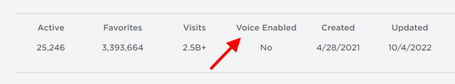 1. Un moyen simple de confirmer si le jeu que vous avez choisi prend en charge le chat vocal ou non consiste simplement à accéder à sa liste Roblox. Faites défiler vers le bas et vous verrez Voix activée avec une étiquette Oui ou Non en dessous.