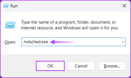 Étape 2 : Lorsqu’une boîte de dialogue Exécuter apparaît sur votre écran, saisissez mdsched.exe et cliquez sur OK.