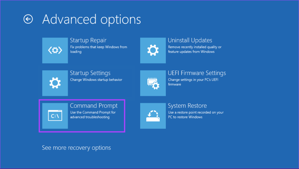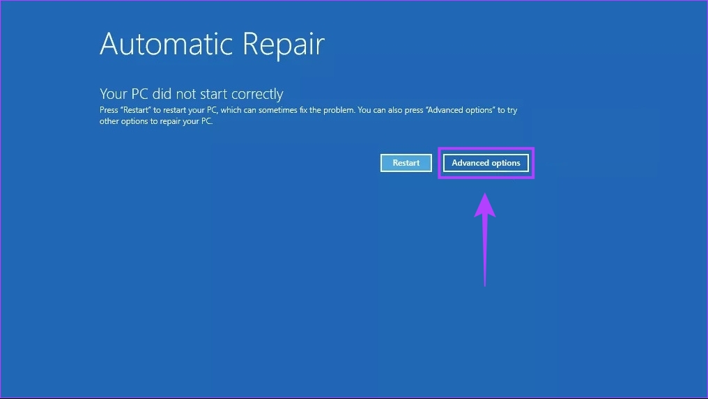 Étape 2 : redémarrez votre PC 3 fois de plus jusqu’à ce que l’écran de réparation automatique s’affiche. Cliquez ensuite sur Options avancées pour accéder au menu Options de démarrage avancées.