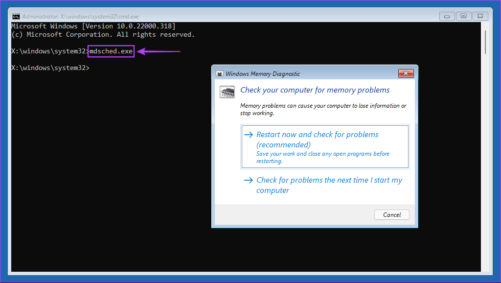Étape 6 : Dans la fenêtre d’invite de commande qui s’ouvre, saisissez mdsched.exe et appuyez sur Entrée. Vous verrez une boîte de dialogue de diagnostic de la mémoire Windows apparaître sur votre écran.