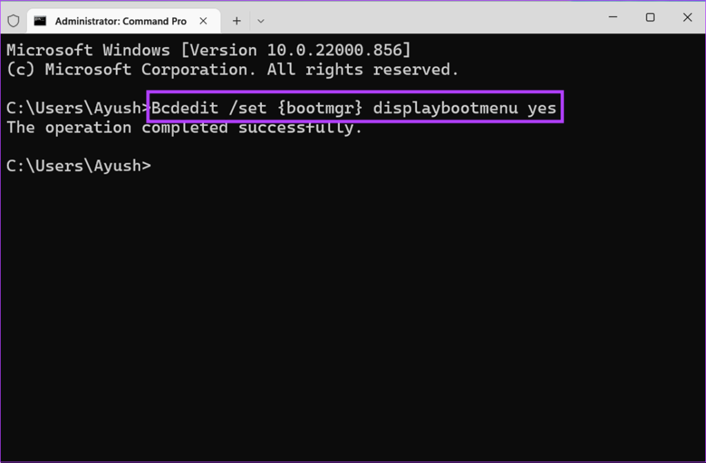 Bcdedit/set {bootmgr} displaybootmenu yes