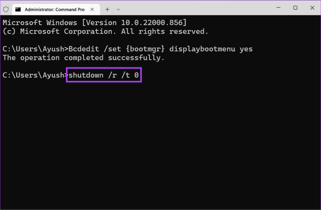 Étape 4 : Copiez et collez la commande suivante, puis appuyez sur Entrée pour redémarrer votre PC.