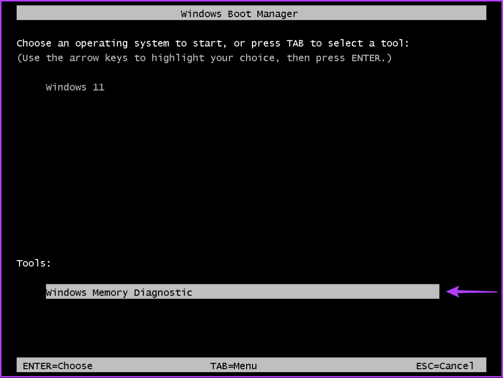 Étape 5 : Lorsque vous voyez le sc du gestionnaire de démarrage Windows Reen, appuyez sur la touche Tab puis sur Entrée sur le clavier pour ouvrir le diagnostic de la mémoire Windows.