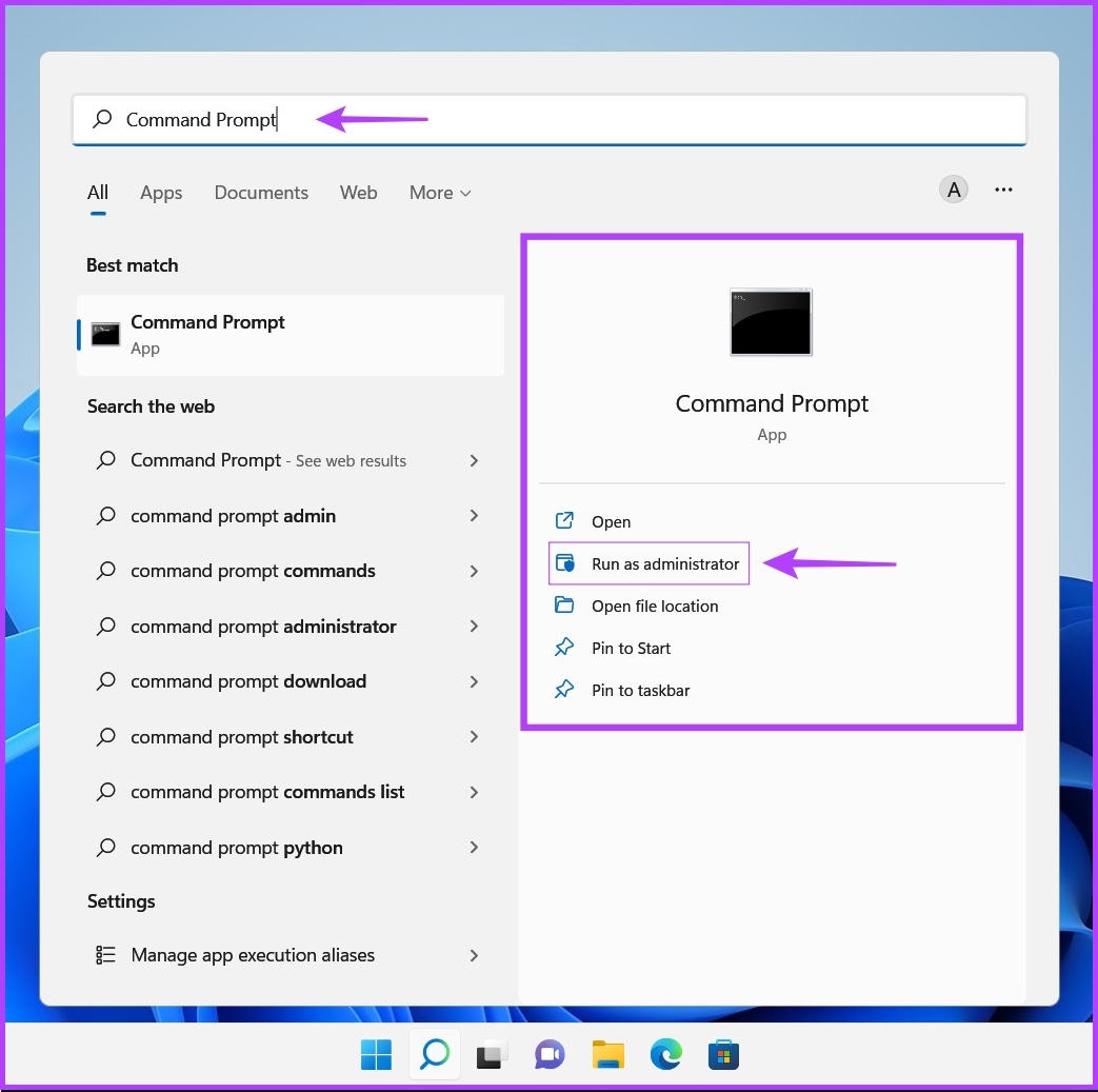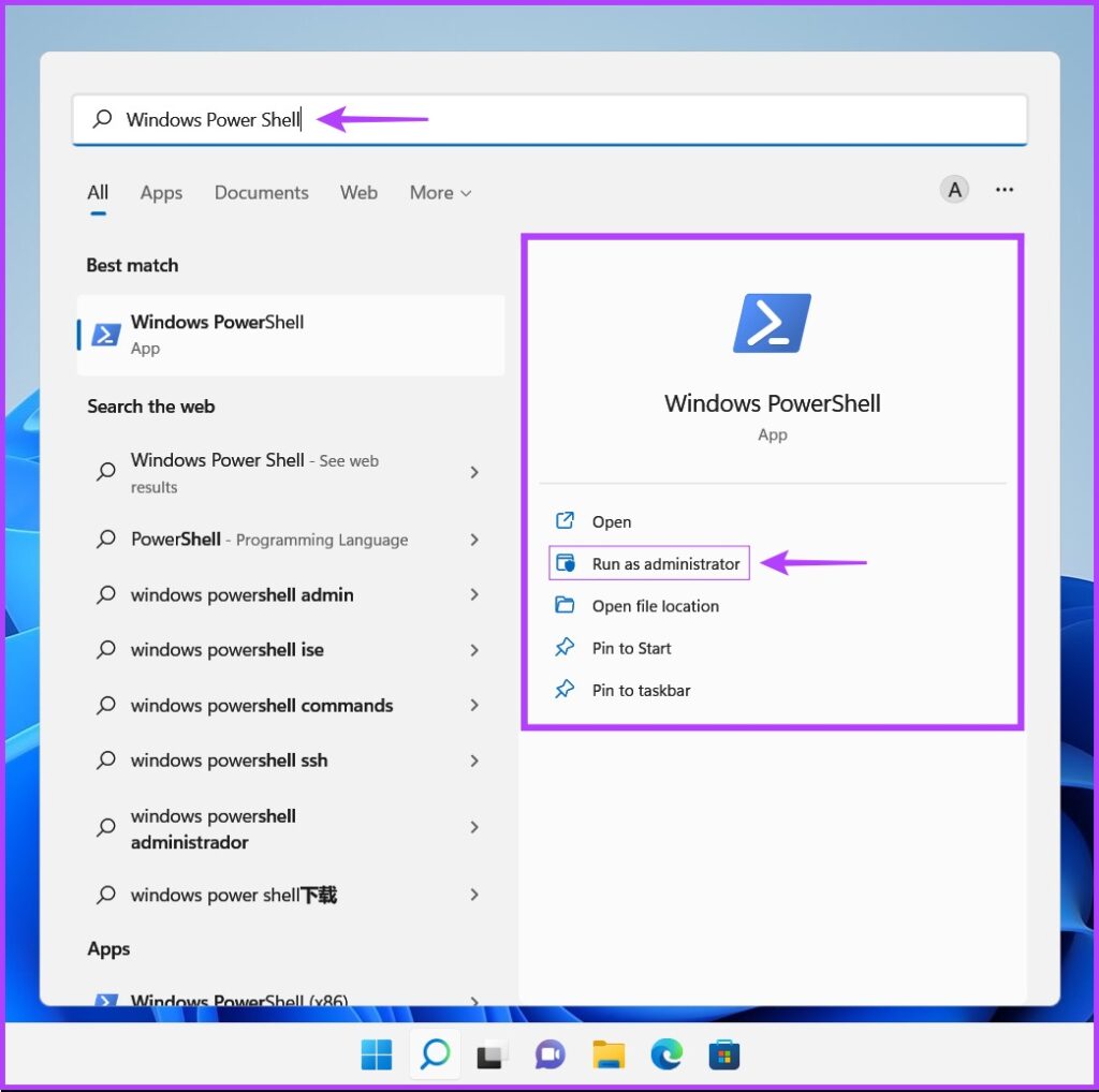 Étape 1 : Appuyez sur les touches Windows + S pour accéder à la recherche et saisissez Invite de commandes. ou PowerShell. Lorsque l’un d’eux apparaît, cliquez sur Exécuter en tant qu’administrateur pour les ouvrir avec des privilèges d’administration.
