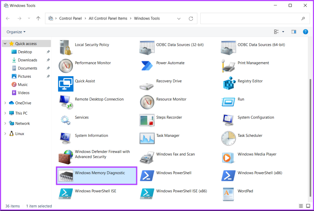 Étape 4 : Lorsqu’une fenêtre Outils Windows apparaît, faites défiler vers le bas et cliquez sur les options indiquant Diagnostic de la mémoire Windows.