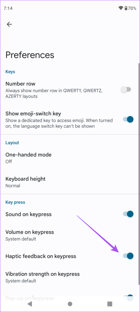 Étape 7 : Faites défiler l’écran vers le bas et vérifiez si le”retour haptique sur la touche”est activé. Sinon, appuyez sur la bascule pour l’activer.