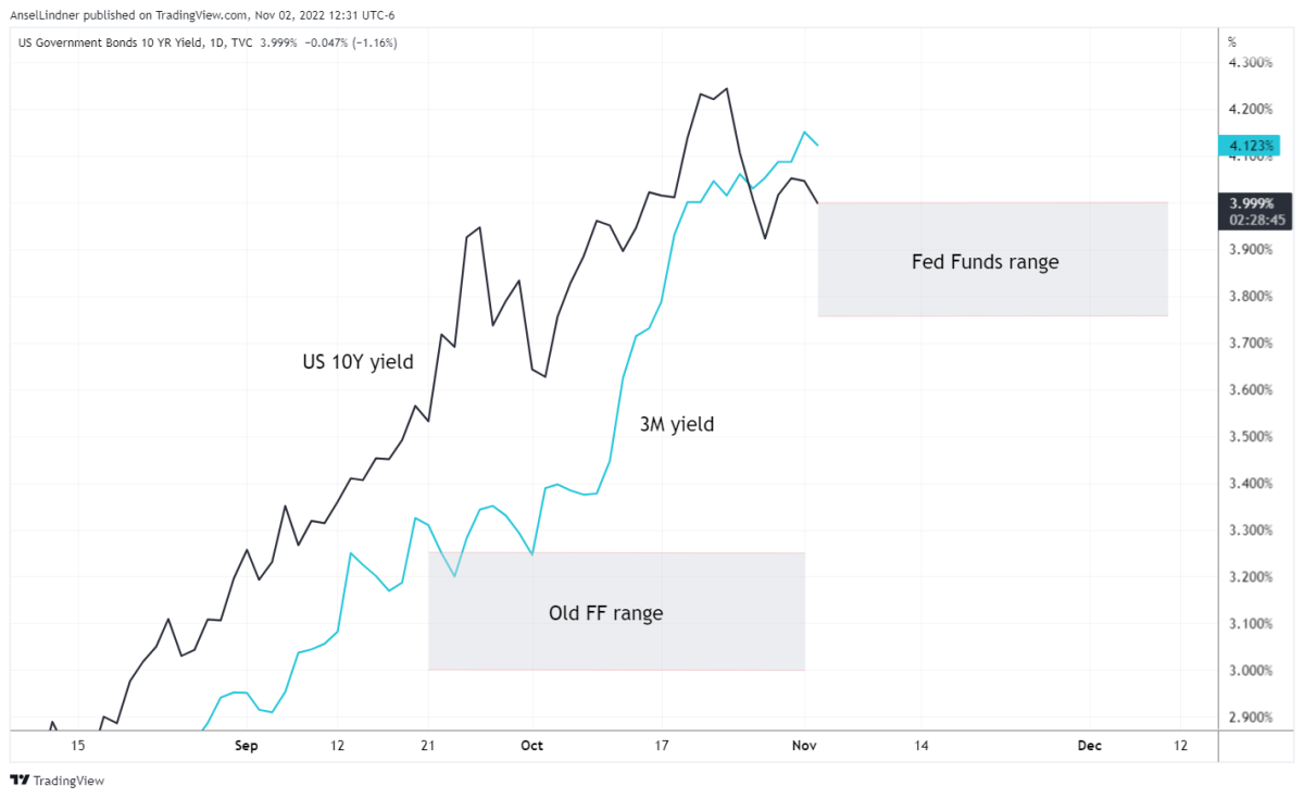 La Fed a relevé les taux d’intérêt de 75 points de base (bps) à un nouveau Fed Funds fourchette cible de 3,75 % à 4 %. Ce n’était pas une surprise. Le marché avait prédit que la Fed ne s’écarterait pas de sa trajectoire lors de cette réunion, malgré les problèmes de liquidité mondiaux apparaissant dans le système financier.