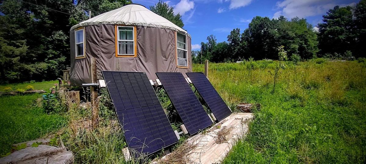 Trois panneaux solaires alimentent la yourte et un mineur S9.