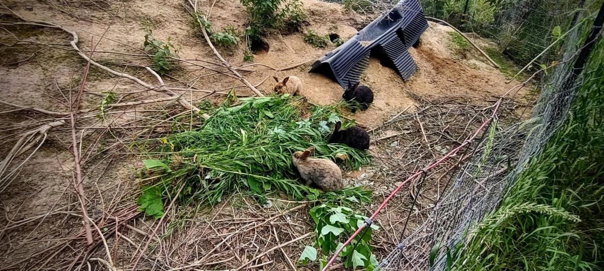 Mettre les lapins là-dedans était une réflexion après coup. Nous avions du mal à trouver où mettre des cages à lapins pour une colonie. Mais nous avions déjà une clôture autour du cannabis, alors j’ai ajouté du grillage autour du bas de la clôture et de chaque plante de cannabis. Les lapins sont chez eux et peuvent grignoter le cannabis lorsqu’il est envahi par la végétation.
